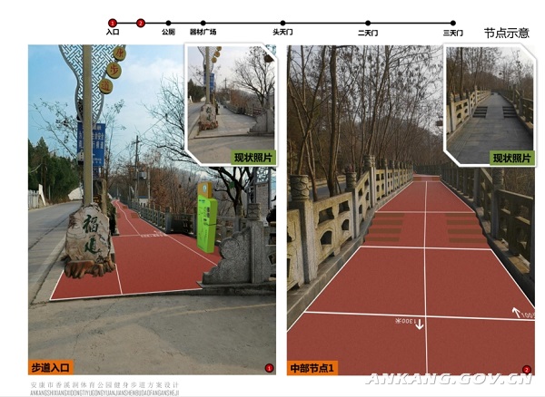 項目實施地點為安康市香溪洞風景區(qū)原有健身步道(水泥路面),北起香溪文化廣場南側,南至香溪洞景區(qū)停車場,全長約1.5公里,寬度介于2.47—3.72米之間。