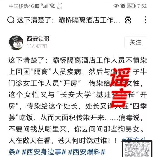 網(wǎng)上流傳一張確認(rèn)病例傳播鏈分解圖,在病例之間標(biāo)注“情人”關(guān)系,并傳言此次疫情傳播因素之一,是因?yàn)槲靼彩桌±c子牛門診的護(hù)士為情人關(guān)系,導(dǎo)致疫情擴(kuò)散,經(jīng)核實(shí),該圖盜用華商網(wǎng)12月18日制作的新聞作品圖片。該信息為虛假信息,造謠的人已被拘留。