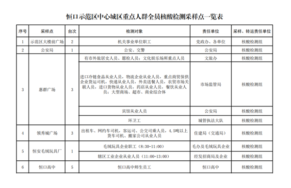 按行業(yè)、類別、區(qū)域,共設(shè)置19個(gè)采樣點(diǎn)、40個(gè)采樣臺(tái)(見附件),具體由各行業(yè)牽頭部門、責(zé)任單位統(tǒng)一安排采樣點(diǎn)設(shè)置、人員組織、秩序維護(hù),檢測對(duì)象按照牽頭部門、責(zé)任單位的具體要求,分時(shí)段有序到指定地點(diǎn)進(jìn)行采樣,避免人群聚集。