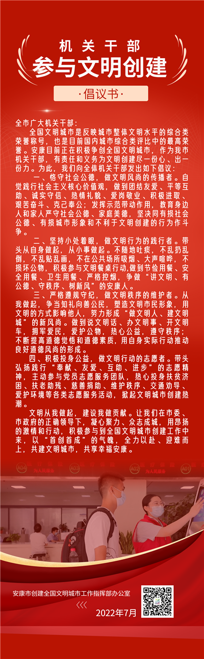 全國文明城市是反映城市整體文明水平的綜合類榮譽稱號,也是目前國內(nèi)城市綜合類評比中的最高榮譽。安康目前正在積極爭創(chuàng)全國文明城市,作為我市機關(guān)干部,有責任和義務為文明創(chuàng)建盡一份心、出一份力。為此,我們向全體機關(guān)干部發(fā)出如下倡議: