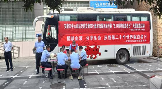 2023年6月14日,在第二十個(gè)世界獻(xiàn)血者日當(dāng)天,安康市中心血站聯(lián)合市行政審批服務(wù)局開展了“文明有我 無償獻(xiàn)血 傳遞溫暖”無償獻(xiàn)血志愿服務(wù)活動(dòng)。