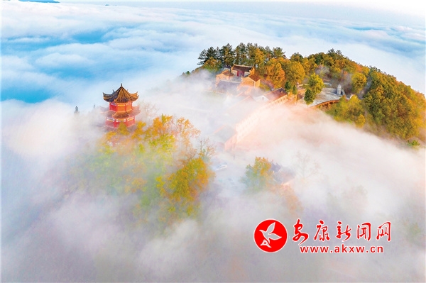 天柱山最美不過秋色,也是我在四季當(dāng)中頻繁上山的季節(jié)。每逢秋天,這里紅黃綠相間,漫山掛彩,在藍(lán)天的映襯下,多了幾分浪漫。從國道211起點的兩條上山公路,由數(shù)個“之”字連接起來,從湖邊一直盤旋至山頂?shù)陌自乒潘?,遠(yuǎn)眺仿佛一個大大的“人”字形飄帶。雨后放晴的頭兩個早晨,在云霧的籠罩下,天柱山的下半身連同湖面一并被巨大的“蠶絲被”覆蓋,山的上半身或山頭浮在云海之上,像是茫茫大海上的一座孤島。