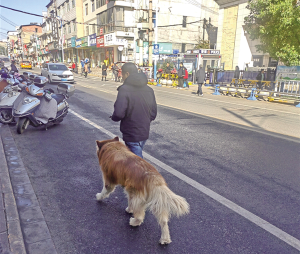11月17日上午,筆者在漢濱區(qū)江北街道中渡路看到,有市民帶著大型犬只不牽狗繩。(高雅 攝)