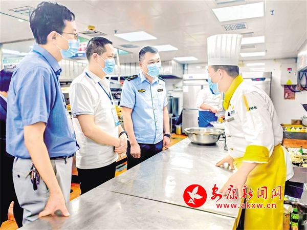 “五一”假日將至,漢濱區(qū)紀(jì)委監(jiān)委會(huì)同市場(chǎng)監(jiān)督管理部門(mén)對(duì)中心城區(qū)酒店餐飲服務(wù)場(chǎng)所開(kāi)展監(jiān)督檢查。圖為檢查組在某酒店后廚了解情況。鄭時(shí)根 攝
