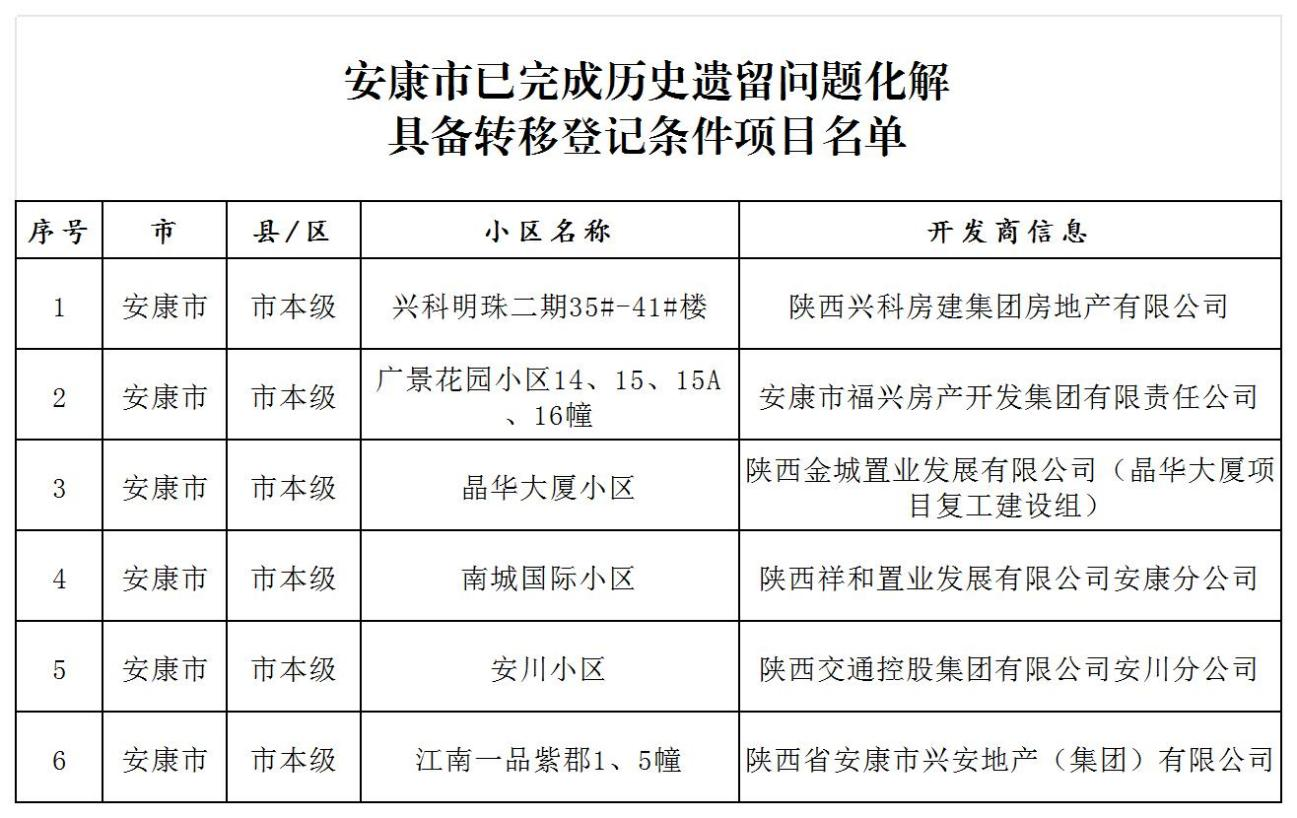 安康市市本級已完成住房領(lǐng)域不動產(chǎn)“辦證難”問題化解具備轉(zhuǎn)移登記條件項目名單的公告