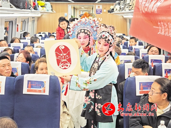 火車穿越秦巴山水間,途中,來自安康漢調(diào)二黃研究院的專業(yè)演員和地方民間漢調(diào)二黃愛好者們一同表演了國家級非物質(zhì)文化遺產(chǎn)——漢調(diào)二黃經(jīng)典戲曲演唱,并為旅客們講解漢調(diào)二黃戲曲知識,與旅客們開展互動(dòng)交流,讓旅客親身體驗(yàn)漢調(diào)二黃戲服道具,感受漢調(diào)二黃的獨(dú)特藝術(shù)魅力。來自漢濱區(qū)文化館的漢濱剪紙技藝傳承人為旅客們展示講解了安康市級非物質(zhì)文化遺產(chǎn)——漢濱剪紙技藝,向參與互動(dòng)的旅客送上了親手創(chuàng)作的漢濱剪紙作品,提前送上新春祝福。活動(dòng)中,西安鐵路公安局安康公安處的民警們和文藝工作者們一同宣傳普及了反詐知識,進(jìn)一步提升旅客的安全防范意識。