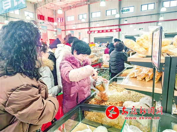 “這里的年貨品類齊全、物美價廉,我選了一些干果和調味料,聽說這里的豬肉都是農家喂養(yǎng)的,看起來很新鮮,一會兒還要買一些回去嘗一嘗。”趕集的劉女士一邊開心地展示著自己選購的商品,一邊和導購交流。