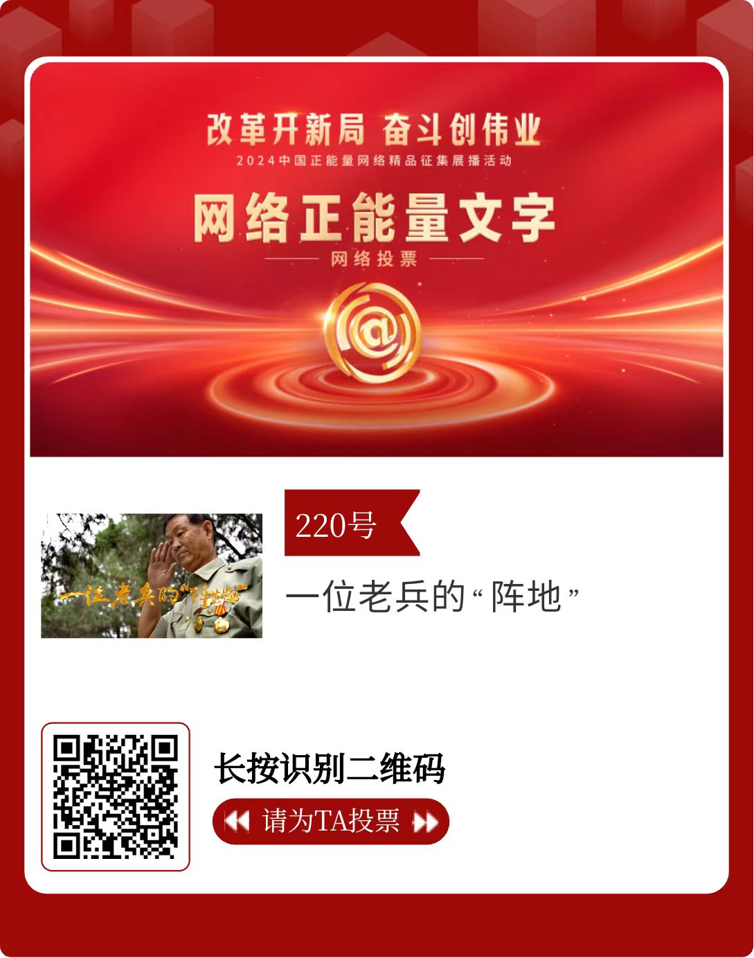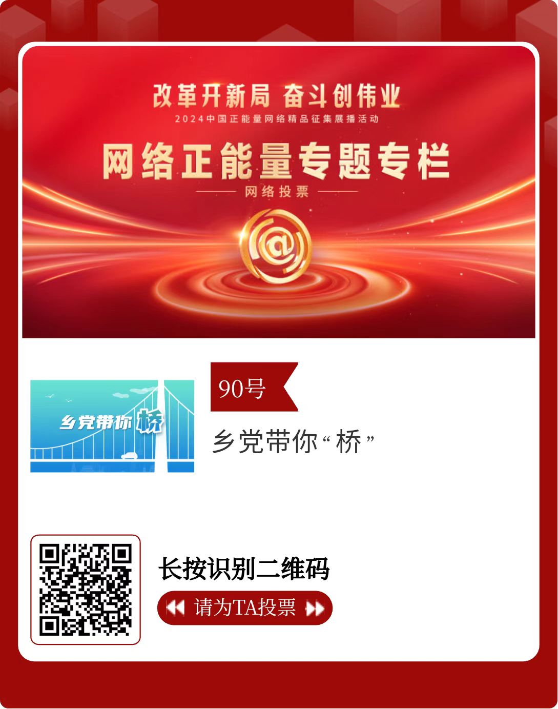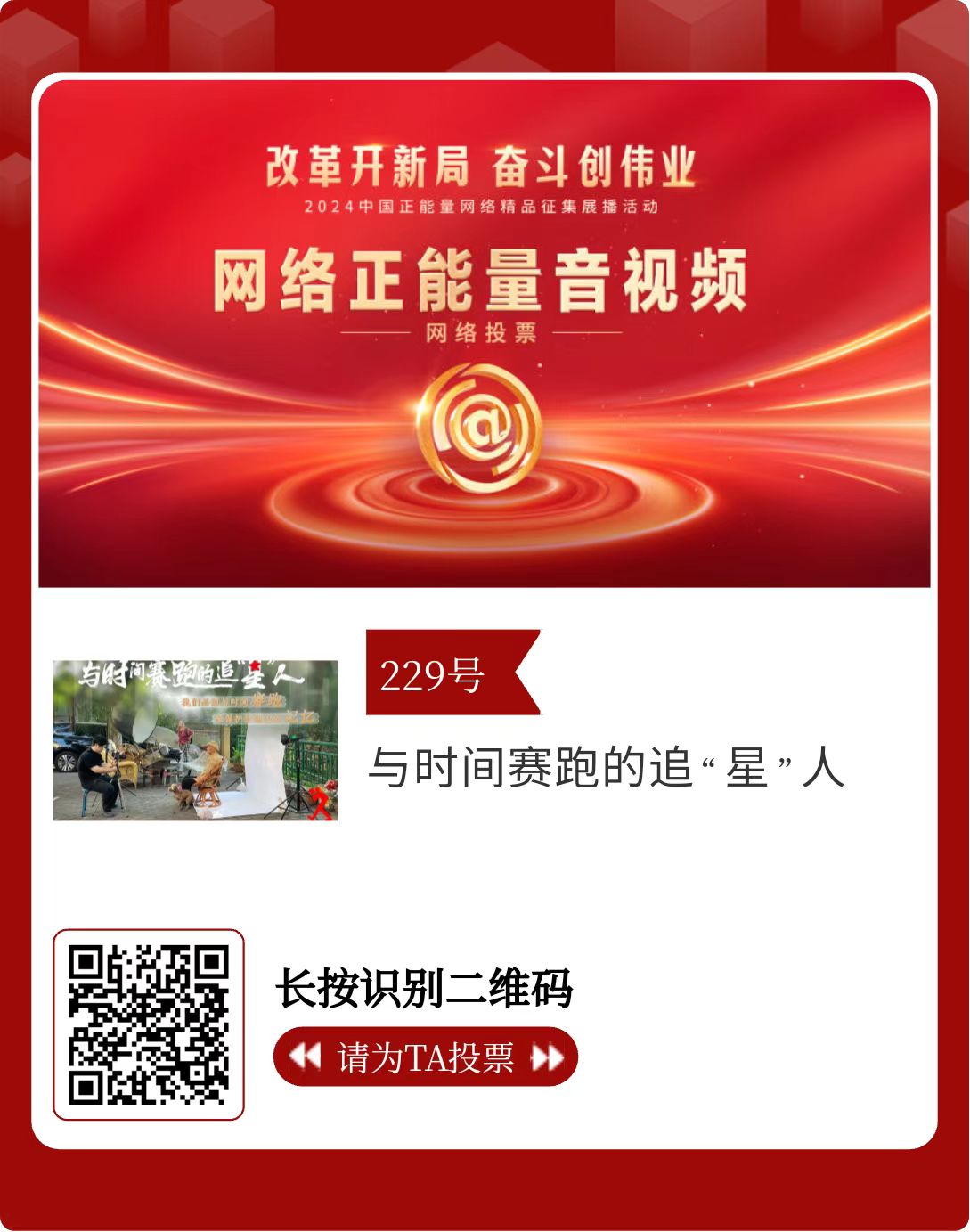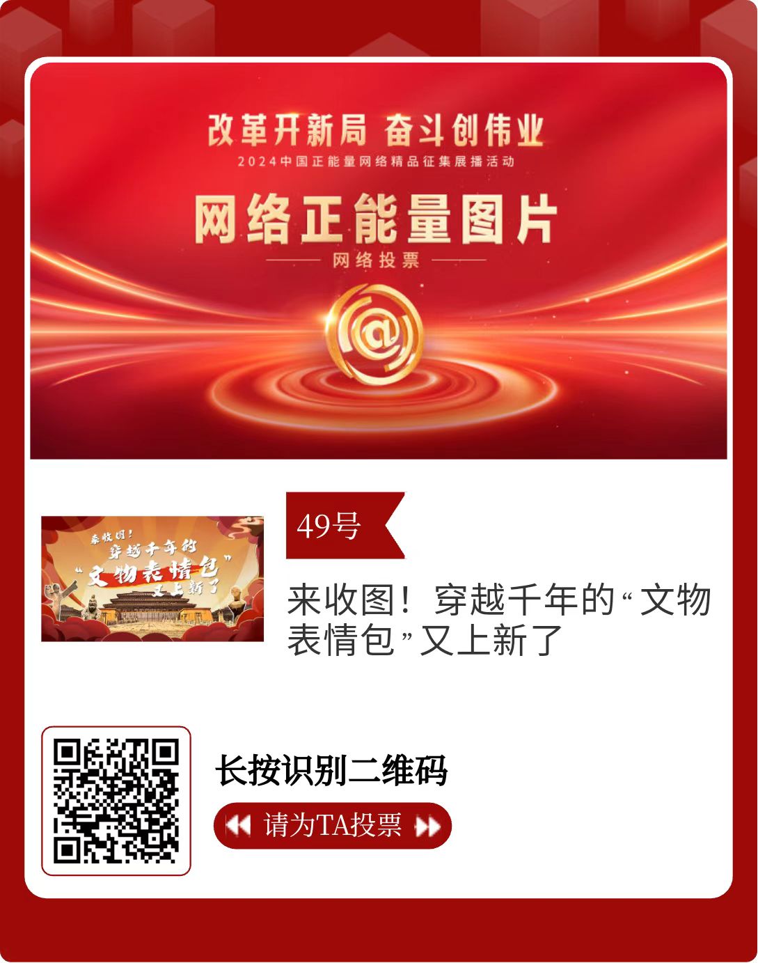 改革開新局,奮斗創(chuàng)偉業(yè)。由中央網(wǎng)信辦主辦的2024中國正能量網(wǎng)絡(luò)精品征集展播活動今天啟動網(wǎng)絡(luò)展播投票。
