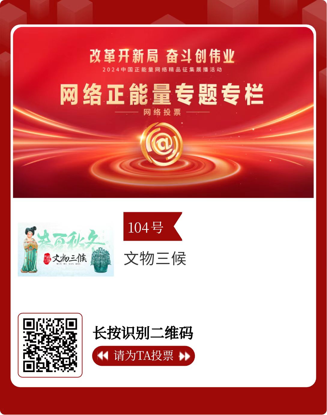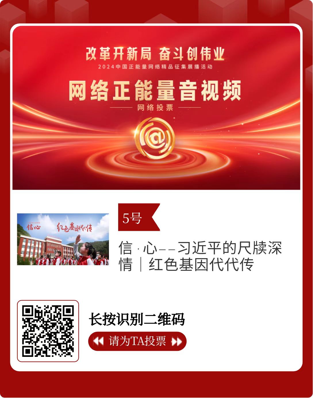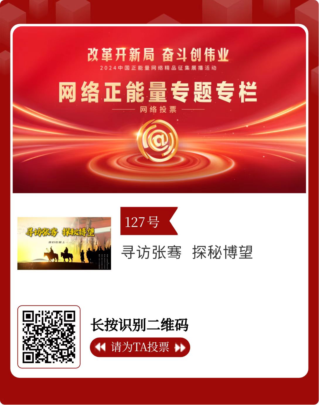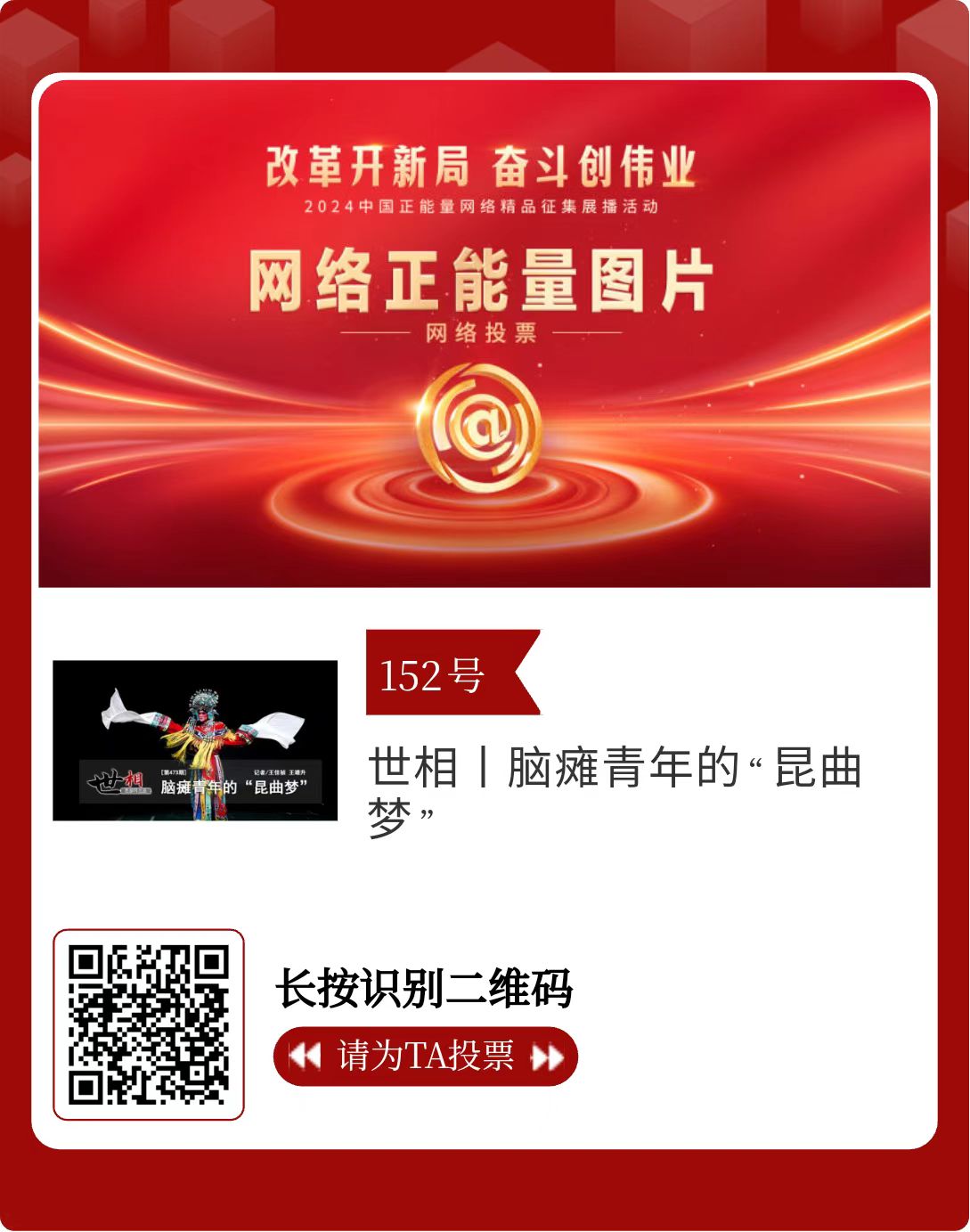 改革開新局,奮斗創(chuàng)偉業(yè)。由中央網(wǎng)信辦主辦的2024中國正能量網(wǎng)絡(luò)精品征集展播活動今天啟動網(wǎng)絡(luò)展播投票。
