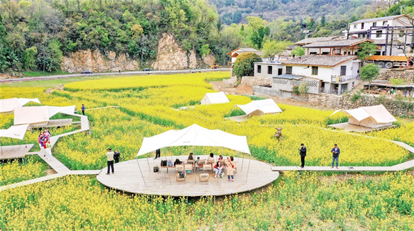 陽春三月,秦嶺腳下,春風彌漫,油菜花開得正旺,朱鹮掠過古村青瓦。白墻黛瓦的民宿群中,咖啡濃香與油菜花香交織,令游人流連忘返,返鄉(xiāng)青年正在直播推介農(nóng)貨……