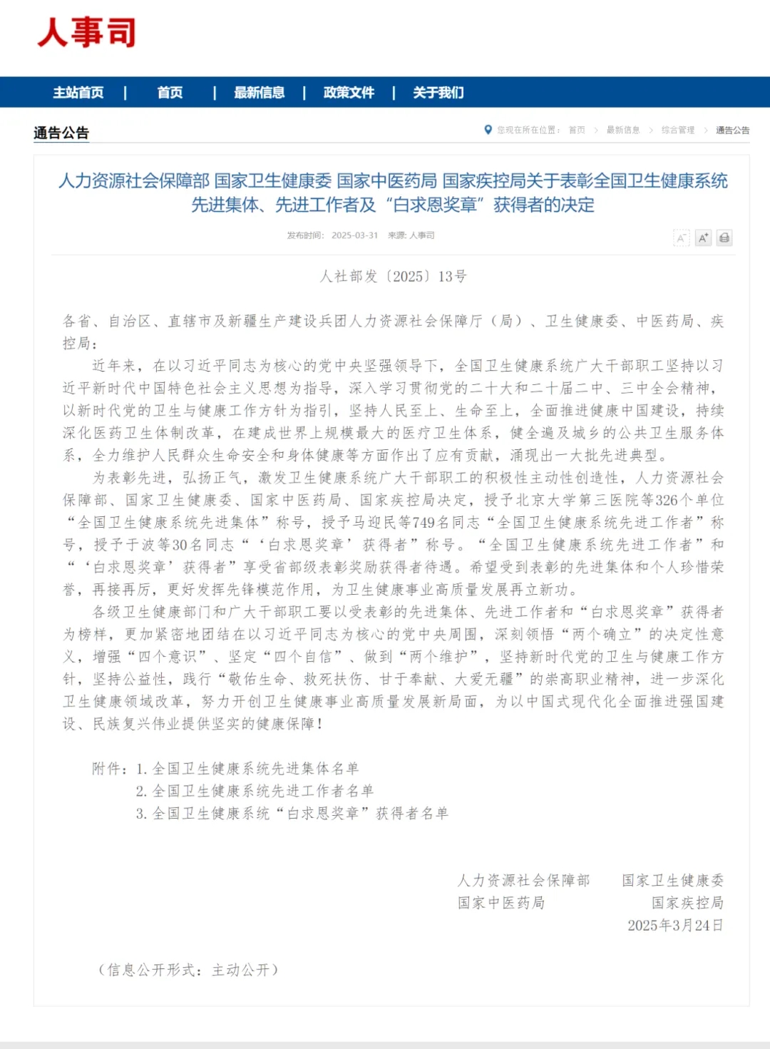 近日,人力資源社會(huì)保障部、 國(guó)家衛(wèi)生健康委等四部委發(fā)布關(guān)于表彰全國(guó)衛(wèi)生健康系統(tǒng)先進(jìn)集體、先進(jìn)工作者及“白求恩獎(jiǎng)?wù)隆鲍@得者的決定,我市1個(gè)集體、1人分別獲得全國(guó)衛(wèi)生健康系統(tǒng)先進(jìn)集體、全國(guó)衛(wèi)生健康系統(tǒng)先進(jìn)工作者榮譽(yù)稱號(hào)。