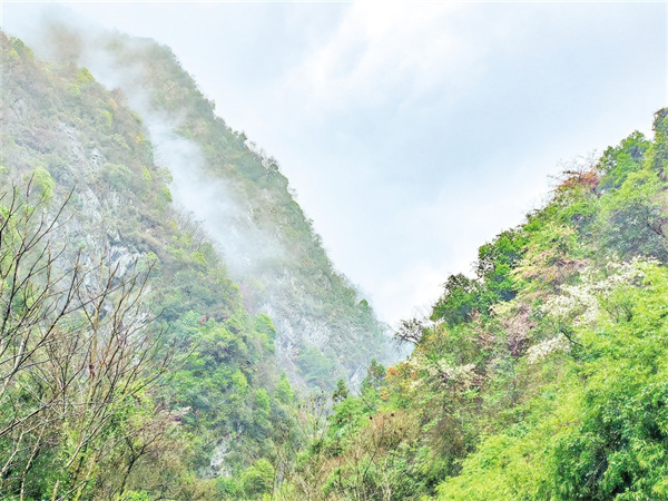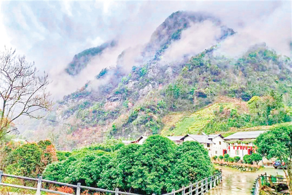 推開房門,晨霧尚未散盡,細(xì)雨斜斜地織著。老人們常說“有雨山戴帽,無雨半山腰”,這話在此時(shí)格外應(yīng)景——裊裊云霧沉甸甸地壓住遠(yuǎn)處的峰頂,像給每座山頭都戴了一頂灰絨帽子,讓群山失去了往日的險(xiǎn)峻,只留下青灰色的輪廓,恍若一幅優(yōu)美的寫意水墨畫。等到午后雨勢(shì)稍小,云霧退到半山腰,卻始終戀著大山不肯消散。隨著一陣陣微風(fēng)拂起,那些云霧像被吹落的玉帶,在墨綠的樹林間織出半透明的簾幕。