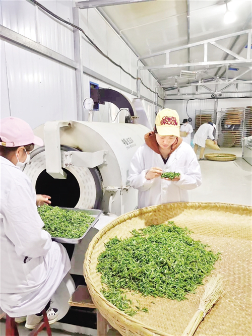 沿著九曲山路攀至絲鋪村五龍山,1200米的海拔高地,500畝生態(tài)茶園豁然舒展在眼前。茶農(nóng)們星羅棋布地穿梭在茶園,夏茶葉紛紛從茶樹間跌落?!案呱讲杌馗首?,這片云海就是天然保鮮庫?!贝逯Р繒洸碳椅妮p捻茶葉,陣陣清香沁人心脾。旬陽五龍山農(nóng)民種植專業(yè)合作社負(fù)責(zé)人王志富打開茶廠卷簾門,生產(chǎn)線熱氣蒸騰?!叭ツ晡覀兪召徚?000公斤鮮葉,加工了1000公斤干茶,產(chǎn)值達(dá)到30萬元,輻射帶動(dòng)周邊村民端穩(wěn)飯碗。”