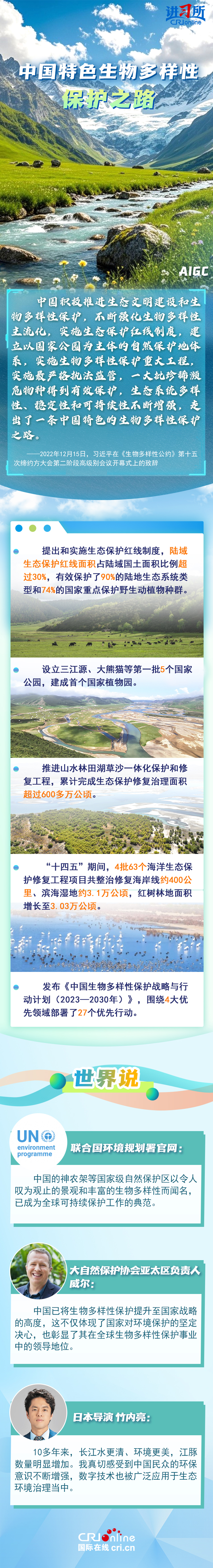 “心往一處想、勁往一處使,共建地球生命共同體?!弊鳛樽钤绾炇?、批準(zhǔn)《生物多樣性公約》的締約方之一,生物多樣性保護(hù)已經(jīng)上升為中國(guó)的國(guó)家發(fā)展戰(zhàn)略。國(guó)際人士表示,中國(guó)的一系列舉措體現(xiàn)出對(duì)生態(tài)環(huán)境保護(hù)的堅(jiān)定決心,同時(shí),中國(guó)依托共建“一帶一路”倡議等國(guó)際合作機(jī)制,為推動(dòng)全球生物多樣性保護(hù)提供了有力支持,在邁向自然友好型未來(lái)的過(guò)程中發(fā)揮關(guān)鍵的引領(lǐng)作用。
