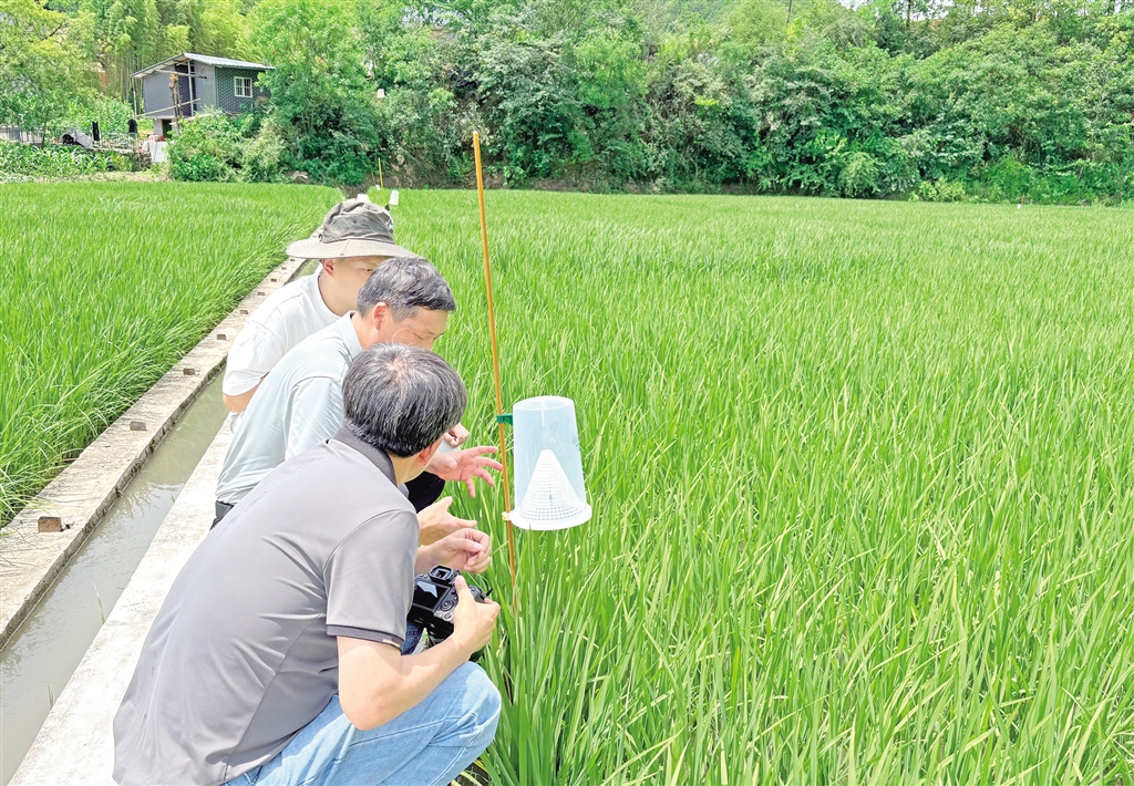 日頭漸漸升高,稻田里的露水被曬成水汽,連片的稻禾舒展著葉片,陽光下泛著健康的碧綠色。黃林權(quán)沿著田壟往前走,每經(jīng)過一個(gè)誘捕器就停下來,或調(diào)整角度,或記錄數(shù)量,鞋上的泥點(diǎn)濺到褲腿上也渾然不覺。