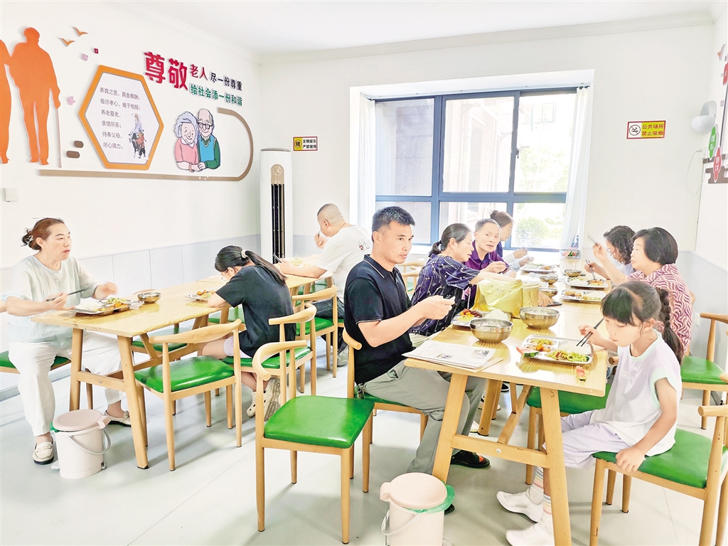 小區(qū)的日間照料中心內(nèi),用餐區(qū)、棋牌室、兒童娛樂室、書法室等一應(yīng)俱全,是居民們心中溫暖的港灣。70多歲的獨居老人袁興瓊,除每周兩次透析外,幾乎都在中心度過?!笆程蔑埐丝煽?,價格也便宜,菜單每天在微信群更新。我們這些老人過上了放下鍋鏟、直接走向餐桌的好日子,每天還有人陪著聊天,生活很舒坦?!?/p>