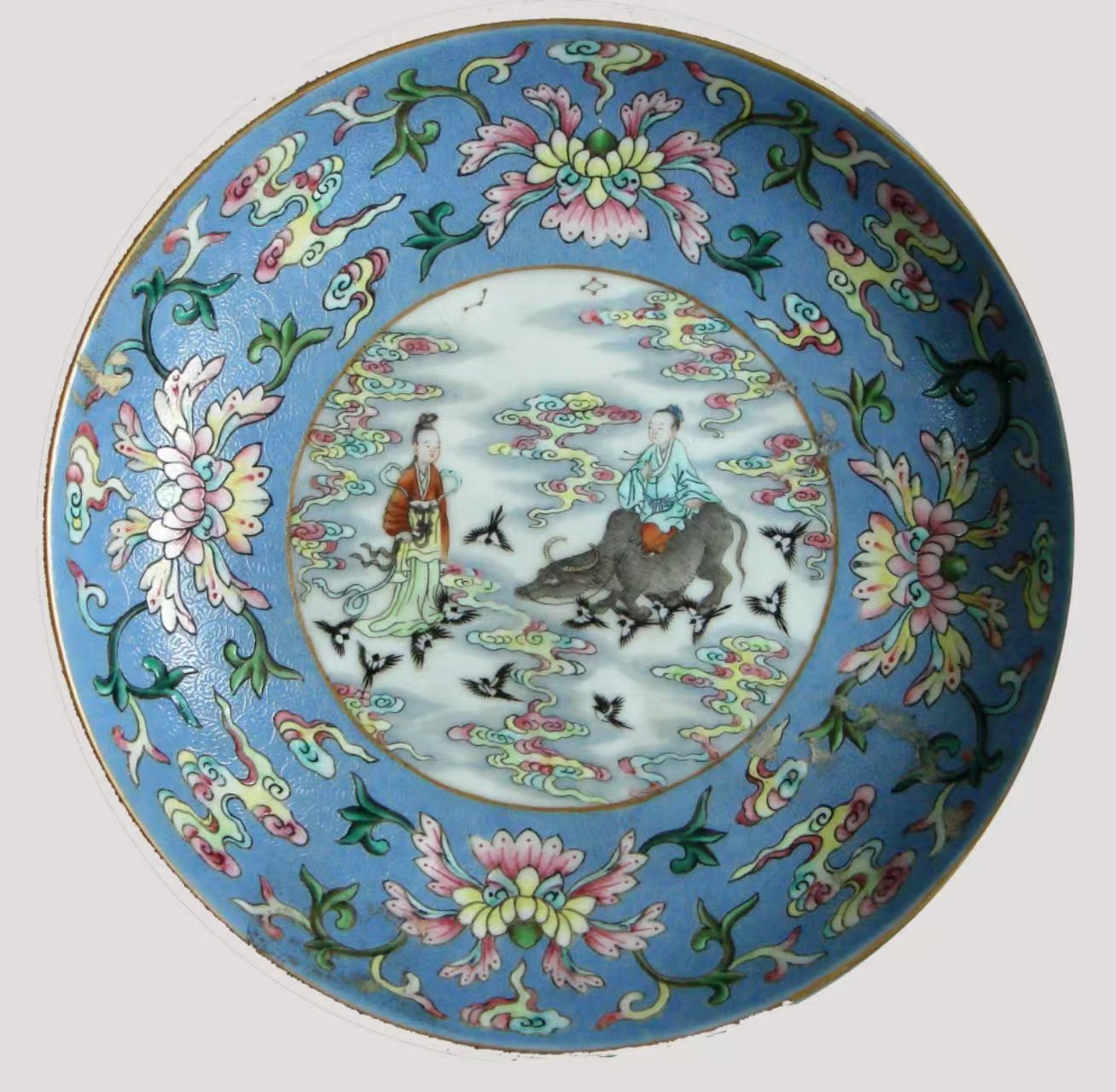 北京藝術(shù)博物館收藏的清代景德鎮(zhèn)官窯粉彩人物圖盤(pán),就像一幅流動(dòng)的七夕畫(huà)卷。此盤(pán)工藝精湛,口沿涂金,熠熠生輝,盡顯皇家氣派。盤(pán)內(nèi)外壁采用“粉彩軋道”工藝,天藍(lán)釉地上淺淺的卷草紋似微風(fēng)輕拂,粉彩花卉與朵云紋相互映襯,如夢(mèng)如幻。盤(pán)內(nèi)底描金圓形開(kāi)光處,粉彩繪就的人物故事圖案更為生動(dòng):牛郎坐于牛背,手握韁繩,深情凝望;織女身姿婀娜,嬌羞回望,二人似在互訴衷腸。背景中祥云繚繞、星辰閃爍、鵲鳥(niǎo)紛飛,為這場(chǎng)相會(huì)營(yíng)造了浪漫的氛圍。外底“鵲橋仙渡”四字,點(diǎn)明主題。