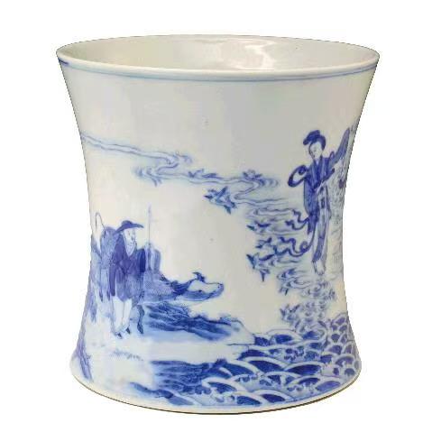 山東博物館收藏的清光緒青花七夕卷筒,也描繪了牛郎織女在天河上即將相會(huì)的情景。卷筒圖案中,祥云繚繞、喜鵲飛舞,鵲橋很快就會(huì)搭成。一年未見(jiàn),牛郎拱手準(zhǔn)備,對(duì)即將到來(lái)的見(jiàn)面迫不及待;織女衣袂飄飄,含情脈脈地望著日夜思念的牛郎。畫(huà)中人物清麗灑脫、典雅高貴,器物主題鮮明、藝術(shù)性較高,真可謂秦觀筆下“金風(fēng)玉露一相逢,便勝卻人間無(wú)數(shù)”的生動(dòng)注解。
