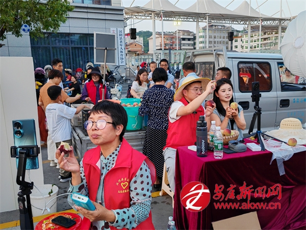 △ 漢陰縣蒲溪鎮(zhèn)第一書記組團(tuán)在縣村超比賽場(chǎng)地外直播賣桃子,累計(jì)幫銷紅桃2.8萬余斤。