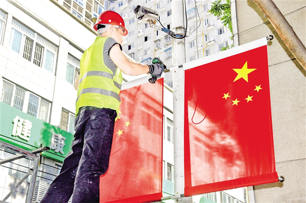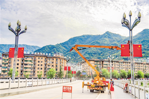 9月25日,紫陽縣城區(qū)橋溝路的大道上,工人正在懸掛國(guó)旗。?彭召伍 攝