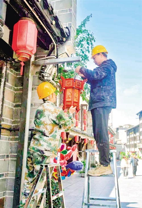 9月24日,石泉縣積極籌備國(guó)慶黃金周旅游服務(wù)保障工作。圖為石泉縣漢江古城景區(qū),工作人員正在更換景觀燈。?譚文昌 攝