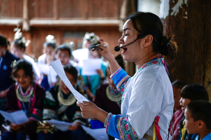 隨著國(guó)產(chǎn)動(dòng)畫(huà)電影《哪吒之魔童鬧?!凡粩嗨⑿轮袊?guó)影史票房紀(jì)錄,參與電影配樂(lè)的貴州省榕江縣三寶侗寨的楊想妮和“舞樂(lè)蟬歌”團(tuán)隊(duì)為更多人所熟知。樂(lè)團(tuán)成員懷揣“用音樂(lè)傳遞侗族文化,讓世界聽(tīng)見(jiàn)侗族大歌”的共同夢(mèng)想,將侗族大歌推向更廣闊的舞臺(tái)。這是2025年4月22日,楊想妮在貴州省黎平縣肇興鎮(zhèn)廈格侗寨教前來(lái)研學(xué)的孩子們唱侗歌。