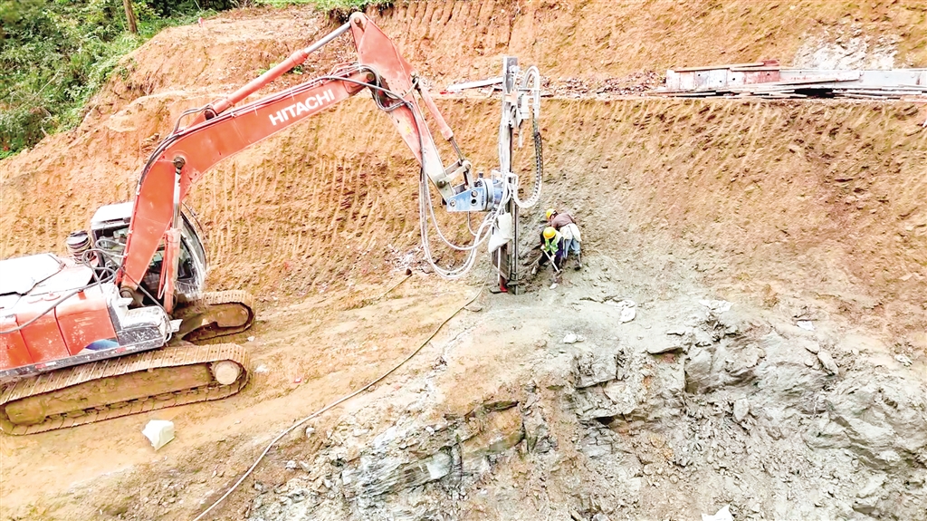 在鳳凰山隧道引線工程(進口段)項目建設現(xiàn)場,機器轟鳴,挖掘機揮舞著鏟斗挖掘土石,運輸車輛往來穿梭,配合默契。工人們鉚足干勁,爭分奪秒搶抓工期,現(xiàn)場一派熱火朝天的施工景象。