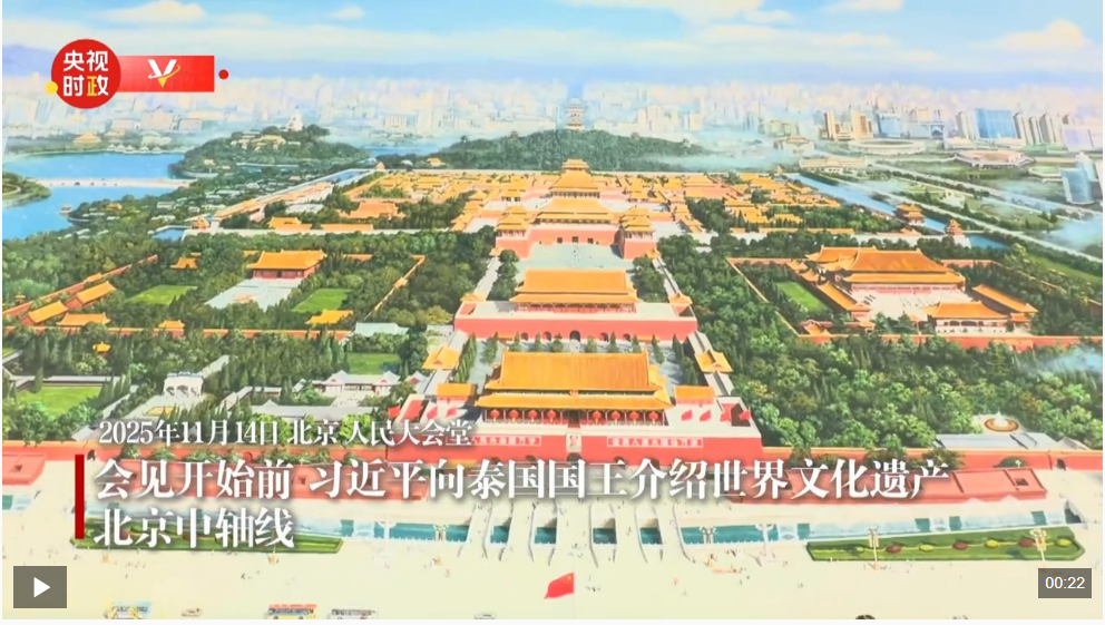 會見開始前,習近平向泰國國王介紹世界文化遺產(chǎn)——北京中軸線。