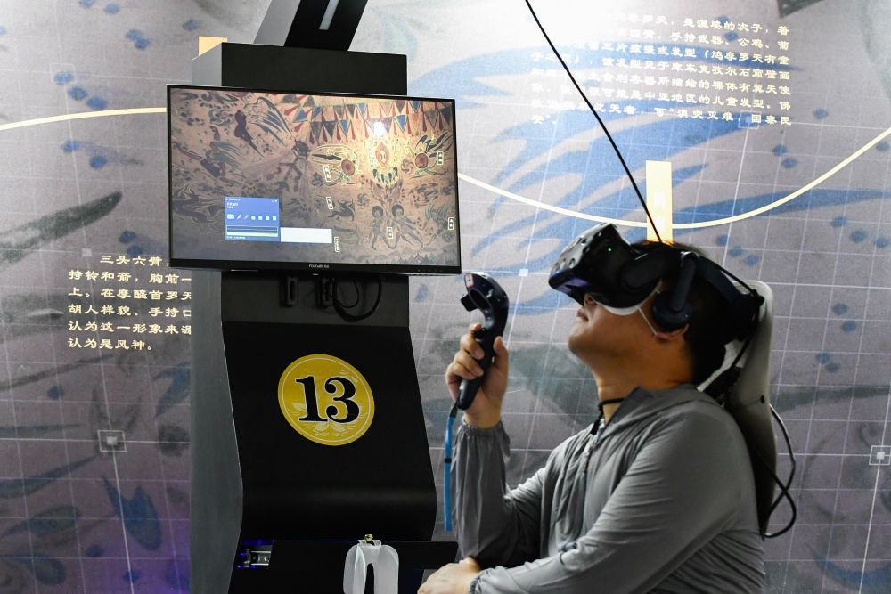??2024年7月22日,一名游客在敦煌莫高窟“尋境敦煌——數(shù)字敦煌沉浸展”上借助VR設備沉浸式游覽莫高窟第285窟虛擬場景。“尋境敦煌”綜合運用了VR虛擬現(xiàn)實、三維建模、游戲引擎的物理渲染和全局動態(tài)光照等新技術,高精度立體還原了莫高窟第285窟。游客戴上VR眼鏡,不僅可以零距離觀賞壁畫、360度自由探索洞窟細節(jié),還能“飛升”到窟頂,身臨其境參與壁畫故事情節(jié),沉浸式感受敦煌文化的魅力。