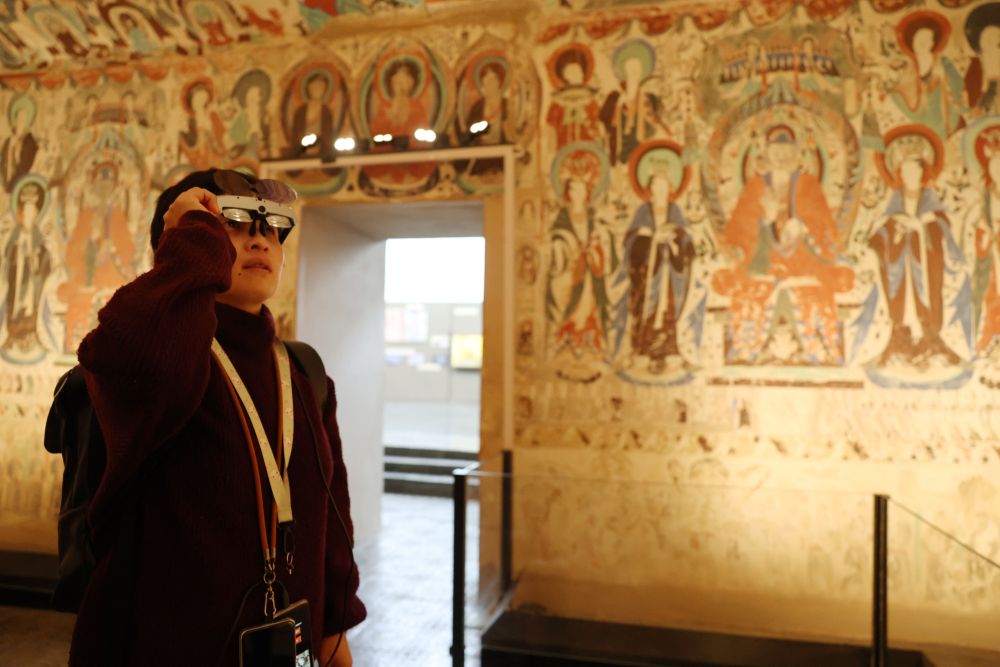 ??2025年10月30日,在敦煌石窟文物保護研究陳列中心,游客使用AR設備在復制洞窟參觀體驗。
