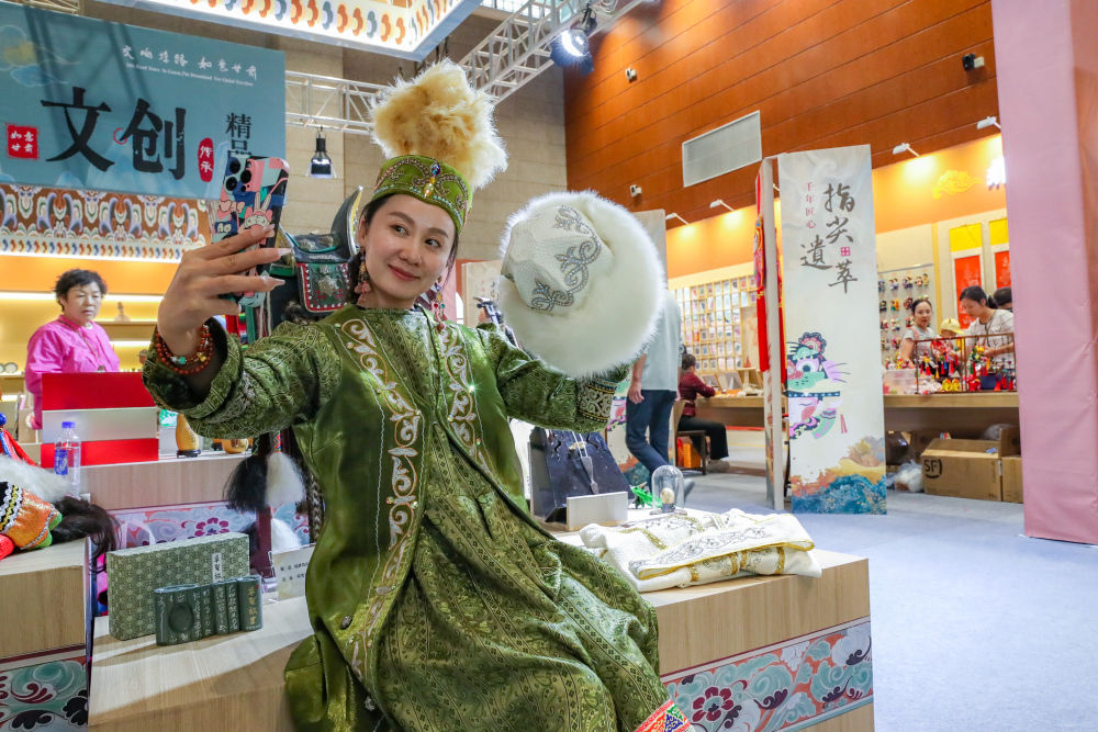 ??2025年9月22日,游客在敦煌文博會上身穿民族服飾自拍。9月20日至22日,第八屆絲綢之路(敦煌)國際文化博覽會在敦煌市舉行。敦煌研究院“典范”“高地”建設成果展、甘肅文旅非遺文創(chuàng)展、敦煌·絲路雕塑展等多項展覽同步亮相,集中展現(xiàn)了敦煌文化遺產(chǎn)保護、研究、弘揚的最新成果以及共建“一帶一路”國家的文化藝術、非遺文創(chuàng)、風土人情等精彩內(nèi)容。