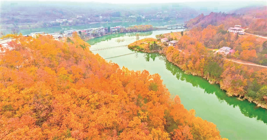 夕陽(yáng)下的沙坪河,斑斕山林與澄澈水色繪就成一幅靈動(dòng)的水鄉(xiāng)畫(huà)卷。郭浩 攝