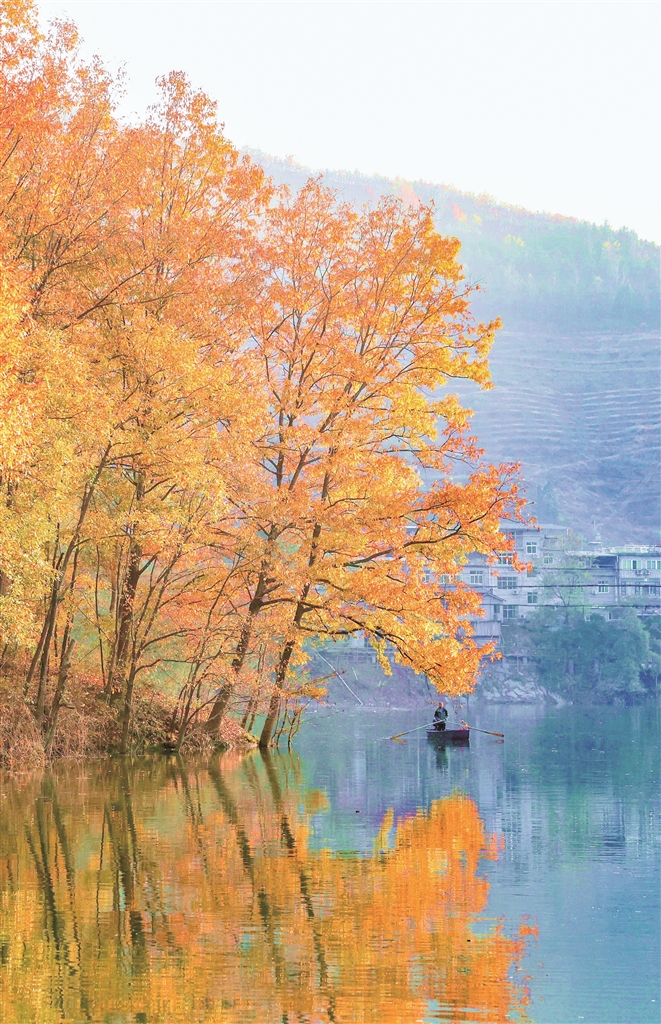 待到霧散天青,沙坪河便展露出它清澈的容顏。兩岸層林盡染,漫山的斑斕都被河水溫柔收納。一川碧水如鏡,完整復(fù)刻出天空與彩林的倒影,虛實(shí)交錯(cuò),舟行其上,仿佛滑入一幅靜止的油畫(huà)。山偎著水,水映著山,靜謐而又絢爛。?