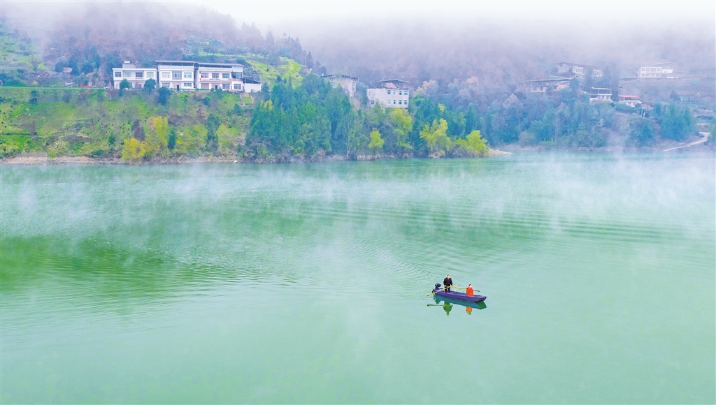 輕舟劃過(guò)晨霧彌漫的江面。李黎 攝