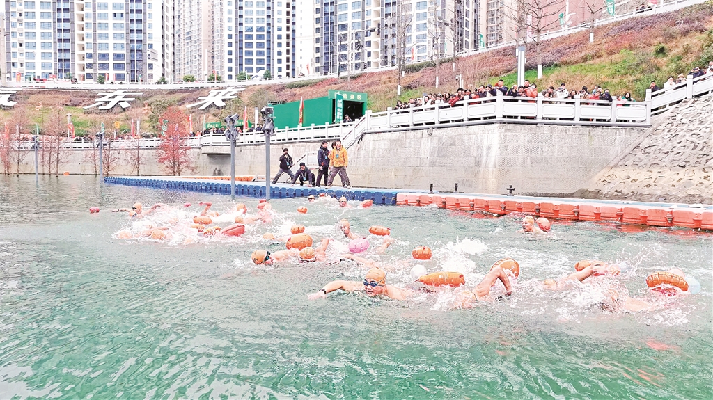 12月21日,陜西省第八屆漢江公開水域冬泳賽在紫陽縣月畔灣廣場水域舉行。當(dāng)天,來自陜西、湖北、四川、重慶、河南、內(nèi)蒙古自治區(qū)的44支代表隊(duì)400余名運(yùn)動(dòng)員報(bào)名參賽。(儲(chǔ)茂銀 攝)