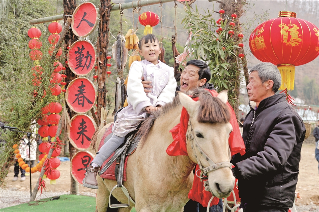 春節(jié)期間,寧陜縣城關(guān)鎮(zhèn)漁灣村舉行“回寧陜過大年”民俗展演。圖為游客體驗年俗活動。楊寧 攝