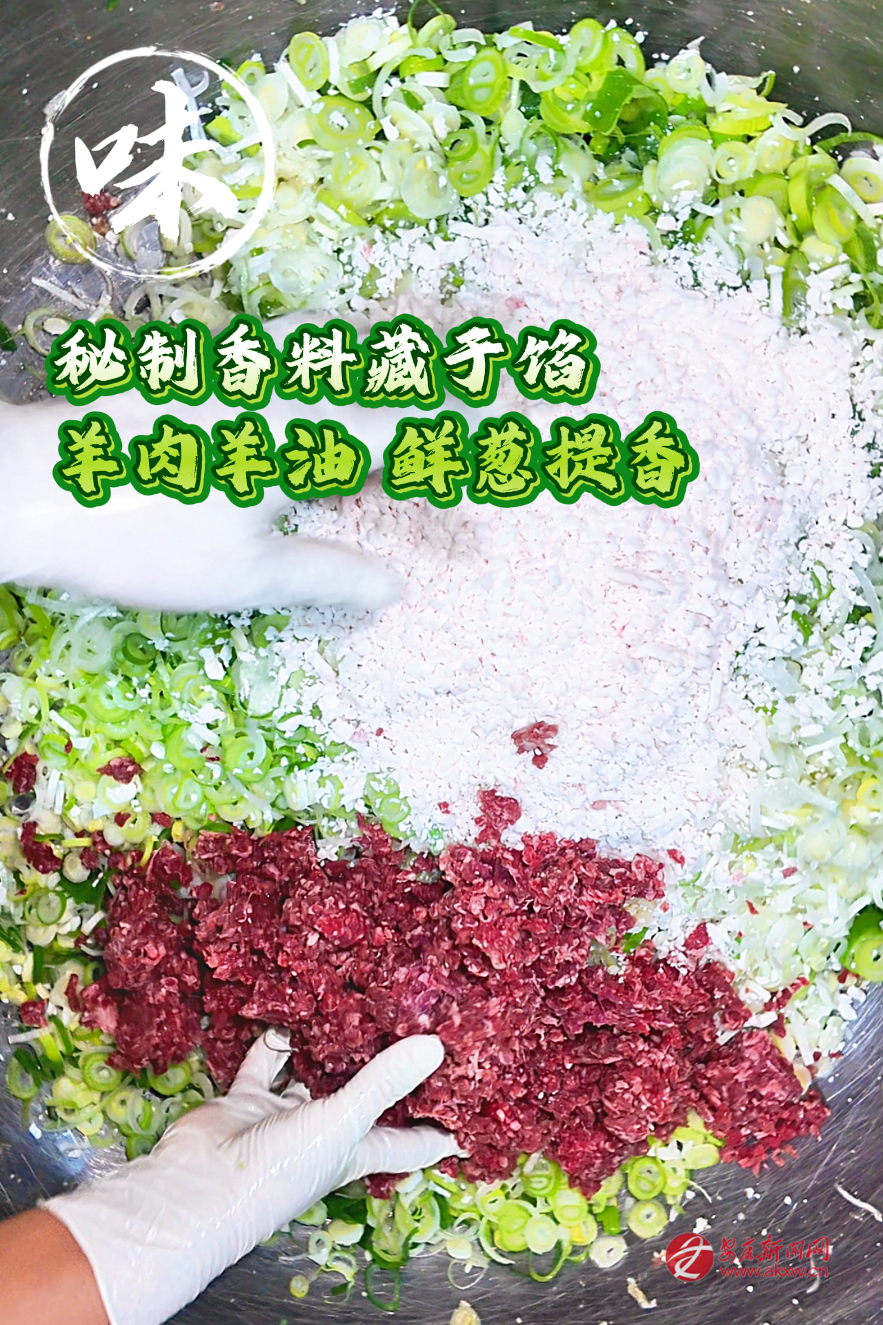 再是做油酥。抓一把面粉,擱碗里,加鹽、五香粉,用滾沸的熟油潑進(jìn)去,筷子急急地?cái)?。那面在油里嗞嗞地響,漸漸融成濃稠的一團(tuán)。這油酥,是餅子起層的秘密。還有餡料。羊肉選用本地的羊,肉切成小小的丁。太肥了不行,須得瘦肉多一些,得加些羊脂丁,那樣煎出來才潤,才有汁水。蔥花要多,要本地的蔥,切得碎碎的,拌上鹽、花椒粉、五香粉。有的還加焙香的苜蓿末,黃黃的,有股子清野的氣味。