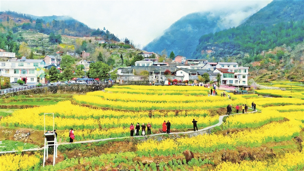 沿著蜿蜒的山路盤旋而上,轉(zhuǎn)過一個山坳,眼前豁然開朗——那金黃的油菜花,竟從山腳一直鋪到云端。層層疊疊的梯田,依著山勢盤旋而上,每一道田埂都勾勒出柔美的曲線。油菜花便順著這些曲線,開得浩浩蕩蕩,開得理直氣壯。晨霧未散時,花海在薄紗般的霧氣里若隱若現(xiàn),恍若仙境;待太陽升高,霧氣褪去,那金黃便愈發(fā)耀眼,直晃得人瞇起眼睛。風過處,花浪翻涌,從這山傳到那山,沙沙的聲響里,滿是春天的氣息。
