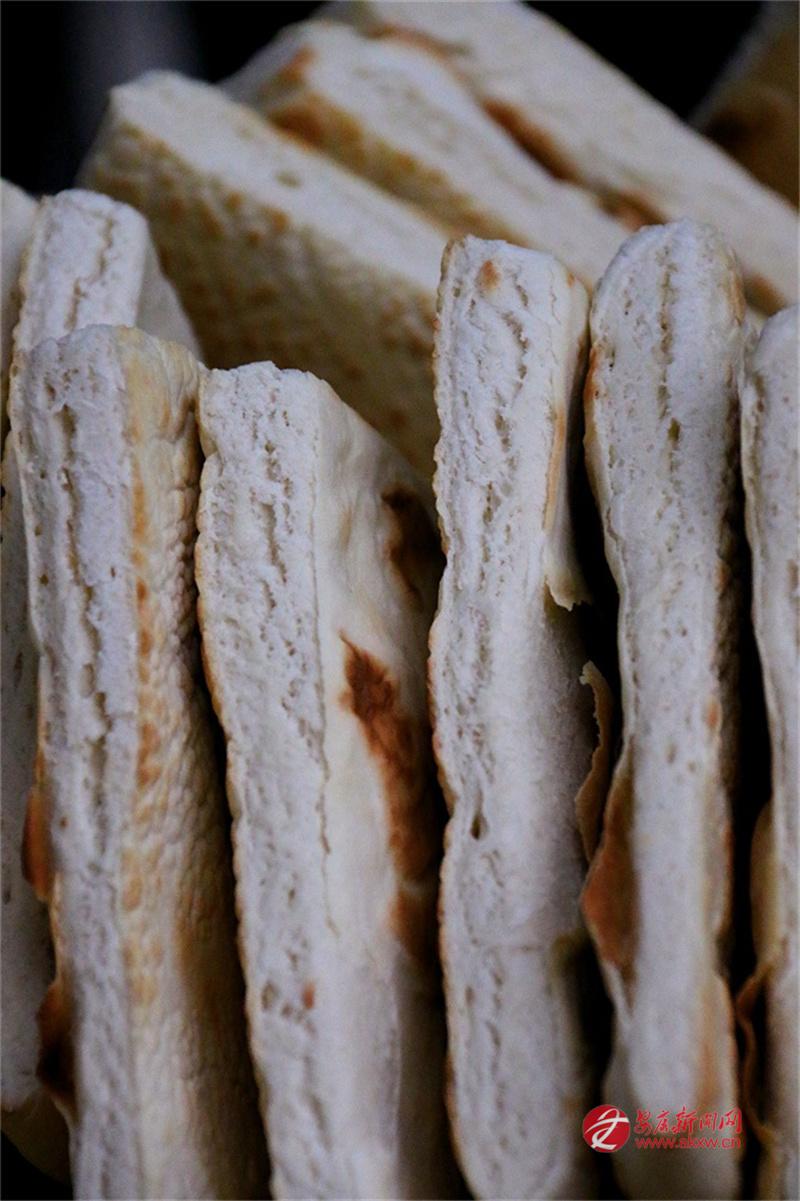 安康的牙牙兒饃是發(fā)面的。發(fā)面,在北方多用于蒸饅頭、包子,用來(lái)打饃且泡在湯里吃的,似乎不多見(jiàn)。安康人卻偏偏這么做了。面粉加了酵母,醒得恰到好處,不能太酸,也不能太生,揉成團(tuán),搟成圓,在鏊子上烙?;鸷蛞m中,兩面烙得焦黃,帶著些許褐色的斑點(diǎn),像是虎背上的花紋,雖不如西安饦饦饃那般白凈,卻多了一股子麥香和火氣。