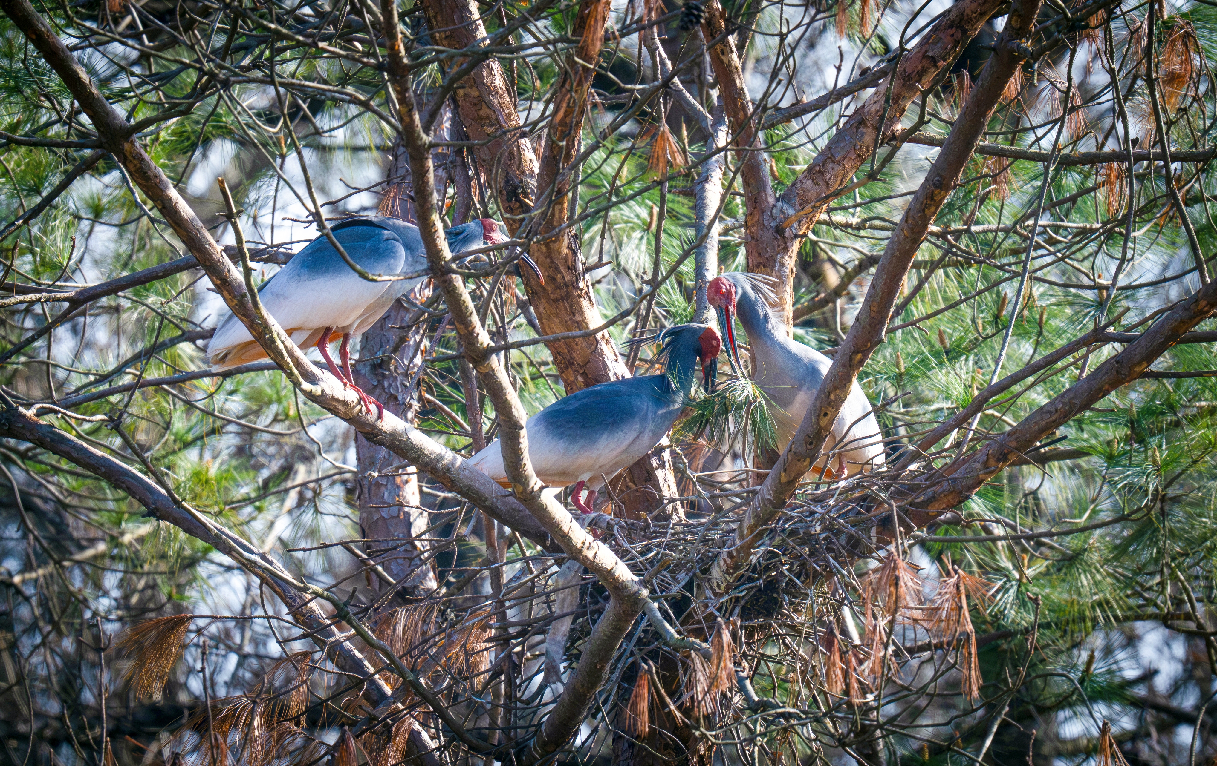 近年來(lái),石泉縣城關(guān)鎮(zhèn)持續(xù)加強(qiáng)生態(tài)環(huán)境與野生鳥(niǎo)類(lèi)保護(hù),為朱鹮營(yíng)造了安全的棲息環(huán)境,促使種群數(shù)量穩(wěn)步增長(zhǎng)。據(jù)觀(guān)察,今春在該鎮(zhèn)草池灣棲息的朱鹮總數(shù)有望突破100只。圖為3月23日,朱鹮在銜枝搭窩、育雛。董長(zhǎng)松 攝