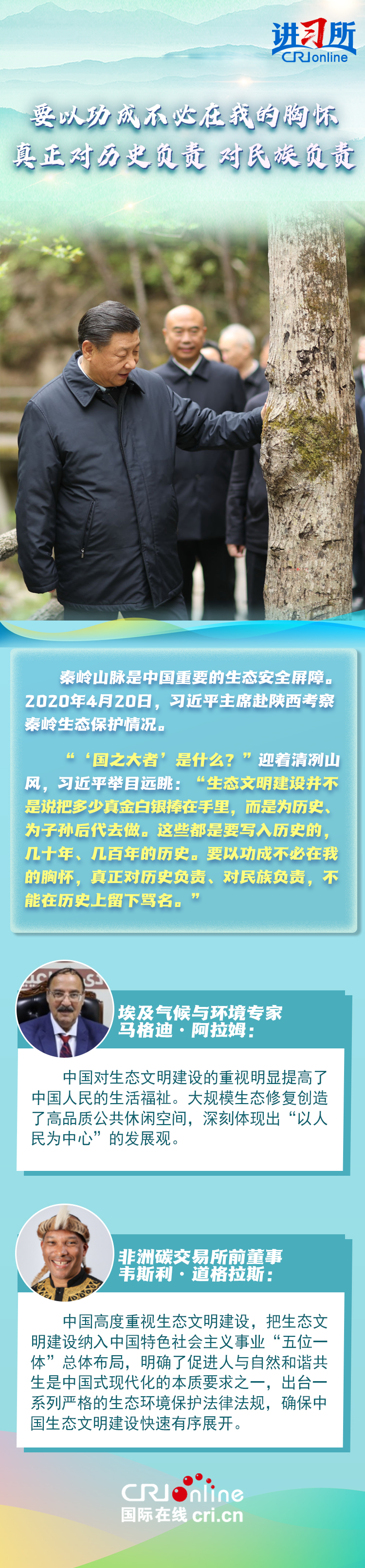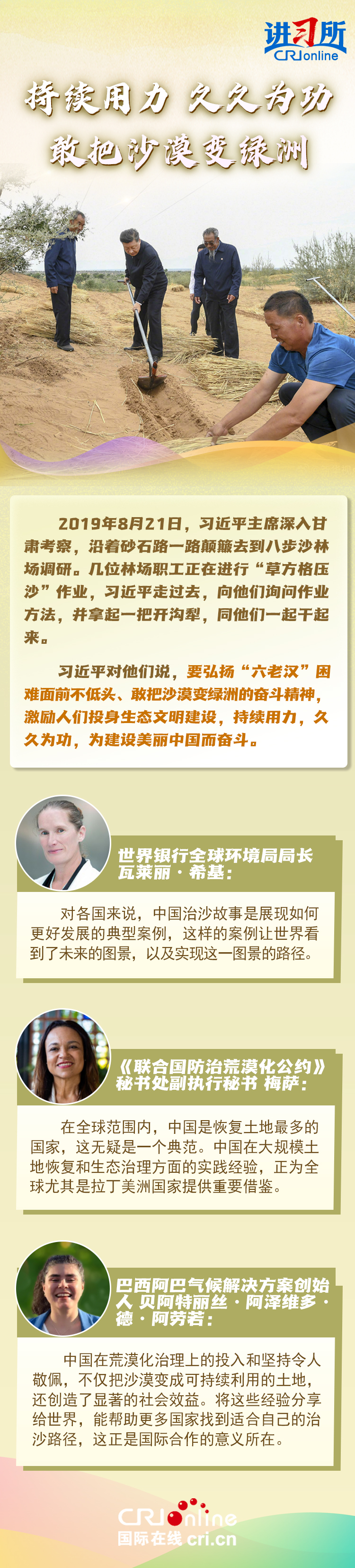 中共十八大以來,中國森林面積和蓄積量持續(xù)“雙增長”,荒漠化和沙化土地面積持續(xù)“雙縮減”,是全球增綠最多最快的國家。習(xí)近平主席始終身體力行:在北京連續(xù)14年參加首都義務(wù)植樹活動(dòng),在甘肅與林場(chǎng)職工一起進(jìn)行“草方格壓沙”作業(yè),在陜西親自“驗(yàn)收”秦嶺生態(tài)保護(hù)……