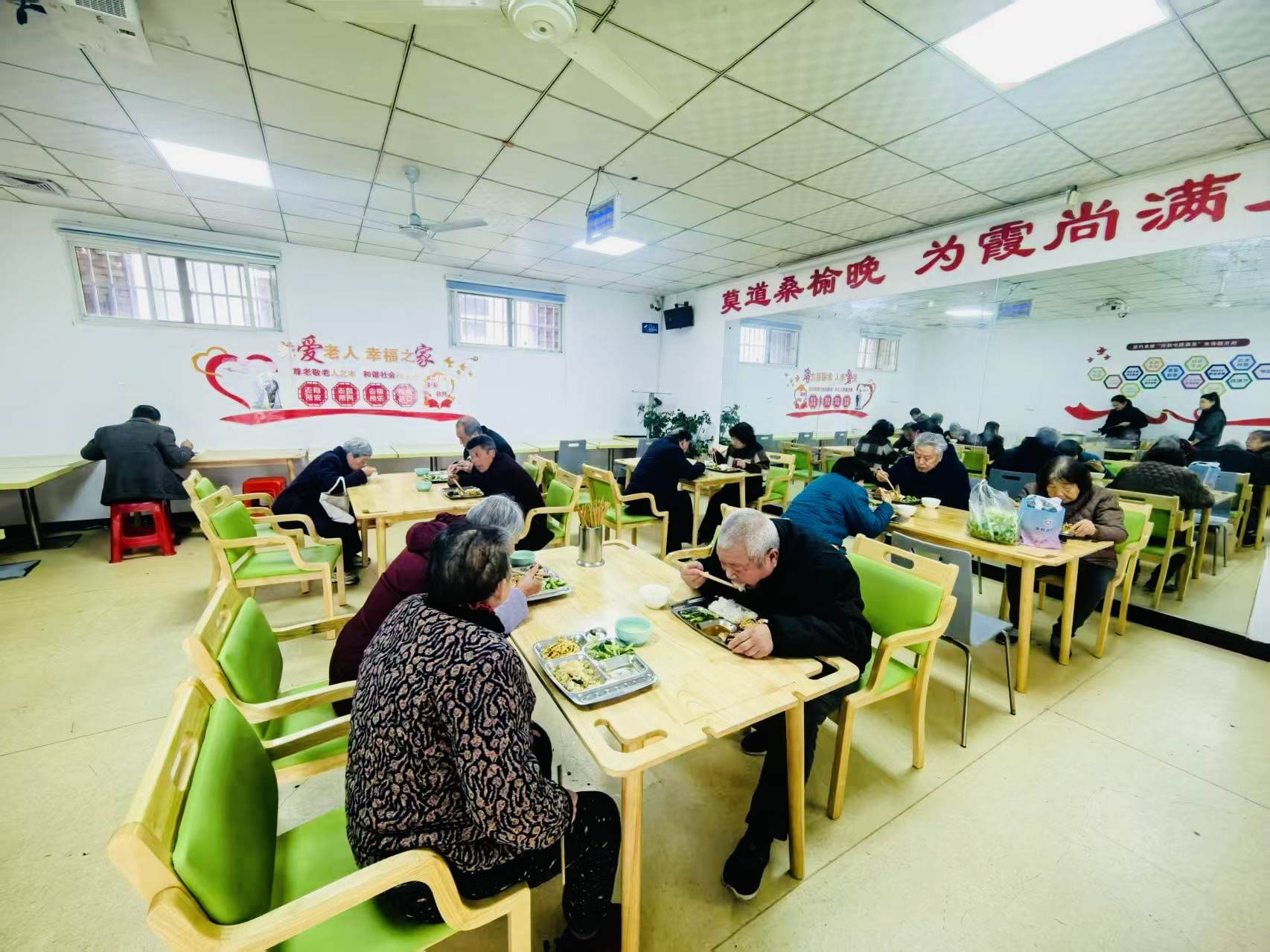 “開飯咯!”隨著廚師一聲洪亮的吆喝,社區(qū)里的老人不約而同地起身,邁著慢悠悠的步子走向餐廳。不一會(huì)兒,一道道家常菜肴就端上了桌:清炒油麥菜脆嫩爽口,酸辣土豆絲開胃解膩,豬肉燉粉條燉得軟爛,老人不用費(fèi)牙就能咬動(dòng),再配上一碗熱氣騰騰的排骨湯,三菜一湯,葷素搭配,既可口又有營養(yǎng)。